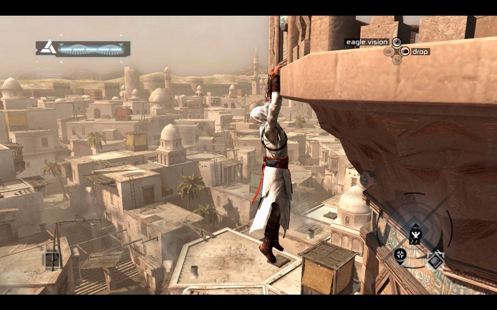 Aunque controlaremos puntualmente a Desmond, sus movimientos están limitados a 2 habitaciones y tan solo podremos caminar, escuchar conversaciones e interactuar con dos o tres objetos, siendo estos momentos una excusa para contarnos algo más acerca del interés de Industrias Abstergo en la memoria de Desmond. Nuestro protagonista estará dentro del Animus durante más del 98% del juego reviviendo las memorias de Altaïr, personaje ya orientado a la acción. He de decir que aunque la ambientación de la época de 1191 está excelentemente lograda, veremos en casi todo momento modernos destellos y efectos digitales introducidos a propósito con la excusa de que existen ciertos fallos de sincronización con el Animus. Además, dado que en el memoria genética de Desmond reside todo lo que jugamos con Altaïr, no podemos morir, siendo tanto nuestros errores como nuestra pérdida de salud sucesos que no ocurrieron y, entrando en juego la barra de sincronización sustituyendo a la de salud, perderemos sincronización en lugar de vida cuando nos hagan daño. La barra de sincronización se reestablece dejando que pase el tiempo o realizando ciertos eventos. Aunque la idea no parece mala, al menos desde mi punto de vista la sensación de inmersión en una época pasada se pierde en gran medida, aunque dejaré ésto en una valoración personal.