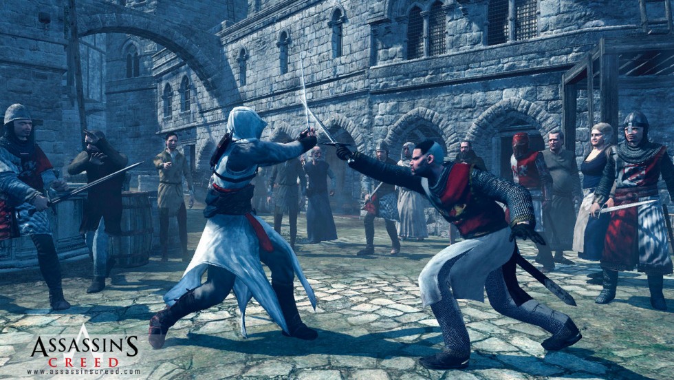 El juego comienza con un tutorial en el que nos enseñarán los movimientos básicos de Altaïr, que puede realizar acciones de perfil bajo o acciones de perfil alto, siendo las primeras orientadas al sigilo y a pasar desapercibido y siendo las segundas orientadas al combate, a la velocidad, a la acción y a liarla en general. Creo que el juego se complica demasiado dando un nombre propio a cada sencilla acción que realicemos, intentando de un modo frustrado revolucionar el género dando nombre a acciones ya de sobra conocidas tanto en juegos de sigilo como de acción y que además existen en la vida real. Podremos caminar, correr, esprintar, apartar a gente para pasar desapercibidos y no tropezar, escalar, saltar, sentarnos, mezclarnos entre grupos de gente… y en cuanto al sistema de combate podremos asestar distintos tipos de golpe, cubrirnos, contraatacar, esquivar, apuñalar a enemigos desprevenidos y un sinfín de movimientos. La mejor parte jugable se la lleva el combate cuerpo a cuerpo, que es sencillamente excelente, pudiendo elegir de un modo muy adecuado al enemigo al que queremos atacar o del cual deseamos cubrirnos, siendo el sistema bueno aún cuando nos enfrentamos a un gran número de enemigos… y vale, sí, mientras uno te ataca, los otros 10 se quedan mirando con cara de gilipollas, pero de lo contrario sería inviable un combate contra muchos enemigos. Tras superar un tutorial más soso que el agua del grifo dará comienzo el prólogo, una misión en la que deberemos recuperar un poderoso artefacto para el líder de nuestra hermandad, Al Mualim. Al comenzar dispondremos de todas nuestras habilidades y armas, pero dado que Altaïr rompe las reglas de los asesinos, es degradado al rango de novato, perdiendo casi todas nuestras habilidades y armas, teniendo además que realizar una serie de asesinatos para nuestro líder.