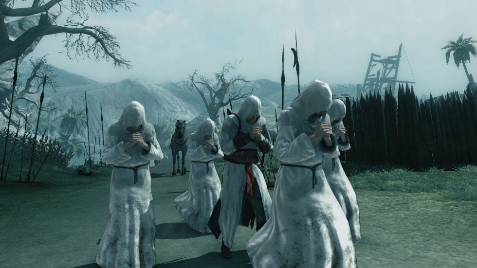 En Assassins Creed el modo de entrar en las ciudades consiste en realizar una misión de defensa a un hombre al que los guardias acosan en la puerta de la ciudad y, tras defenderlo, se unirá a un grupo de monjes eruditos entre el cual nos podemos mezclar pulsando un botón y dejando que avancen por sí solos con nosotros hasta estar dentro y, eso sí, no dejéis de pulsar el botón porque os pillan. No sería un problema si este método fuese uno de los existentes para entrar en las ciudades, pero cada vez que vayamos a una nueva, deberemos defender al dichoso erudito al que los guardias acosan con las mismas líneas de diálogo y tras hacerlo, pulsar el mismo botón. ¿Pero qué coño es ésto? No busquéis métodos altenativos porque no los hay; en 1191 parece que solamente era posible acceder así a las ciudades.