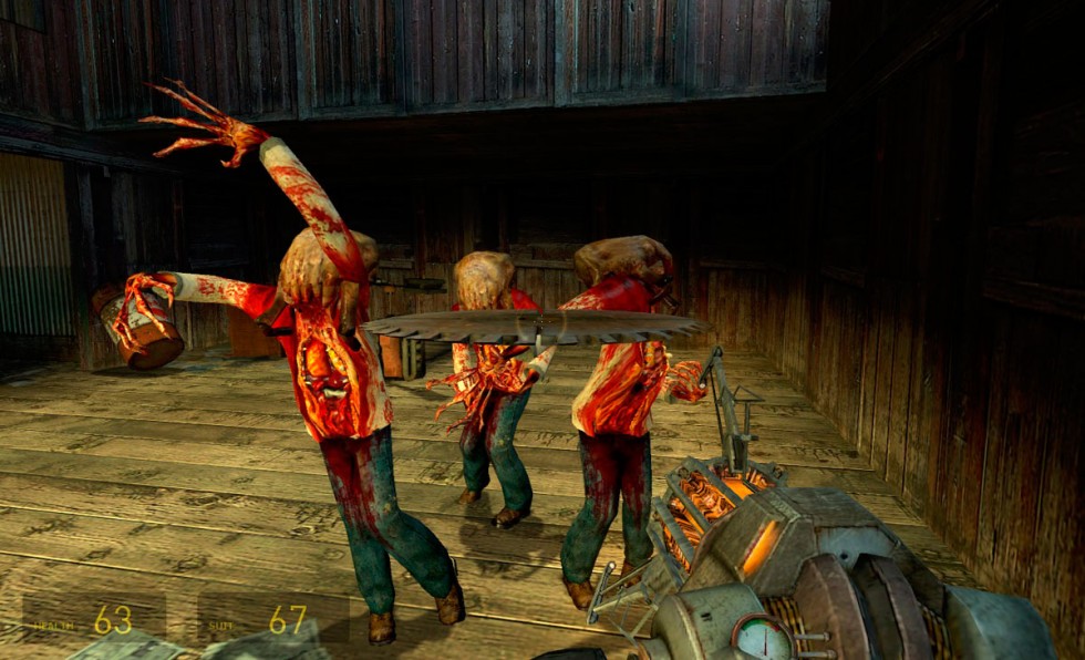 Son algo fundamental en cualquier shooter y un buen repertorio es indispensable en este título. Nuestra palanca, una beretta, la magnum, la escopeta, la ametralladora, la ballesta con zoom, la escopeta y el lanzacohetes repiten su presencia de nuevo, sumándose en esta ocasión la pistola de gravedad y un rifle de pulsos Combine bastante bruto. Casi todas las armas cuentan que un disparo secundario ya que por ejemplo con la escopeta podremos disparar los dos cartuchos a la vez y con la ametralladora podremos lanzar una granada para posteriormente soltar ráfagas de disparos para los que queden en pié. Aún así, el número de armas se antoja escaso en comparación del original, aunque cierto es que se ve compensado con la versatilidad del arma de gravitatoria, útil por ejemplo para agarrar bidones de gasolina y hacer que exploten al lanzarlos contra nuestros enemigos.