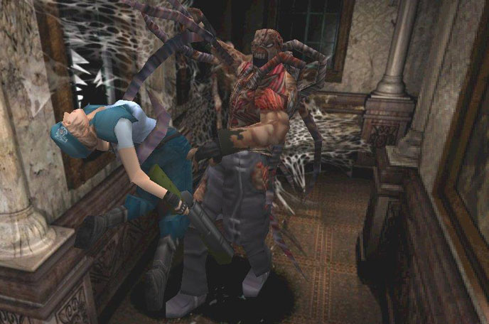 Nemesis: La coletilla del juego o lo que se supone que justifica la nueva entrega. Se trata de un arma biológica en forma de bicho gigante que Umbrella envía a Racoon city para terminar con los supervivientes del grupo policial STARS. Capaz de correr mucho más rápido que nosotros y portar un bazooka que no vacilará a la hora de utilizar, Nemesis será una amenaza constante en el juego. Puede que su diseño sea insulso, pero la sensación de amenaza constante está muy lograda, haciendo que nos pongamos tremendamente nerviosos ante la duda de si lo hemos despistado o no, puesto que será capaz de perseguirnos por todo el escenario a excepción de las salas de guardado, toda una novedad. Nemesis viene siendo la evolución del bicho gris que nos amenazaba en el segundo escenario de Resident Evil 2, ya que tampoco podremos matarlo sino dejarlo inconsciente y también irá evolucionando. Como he dicho, los jefes finales son decepcionantes y aquí incluyo a Nemesis, pues sus evoluciones se basan en agregarle tentáculos y hacerlo más voluminoso, algo que ya tenemos muy visto, por no hablar del decepcionante combate final. Yo me quedo con William de Resident Evil 2.