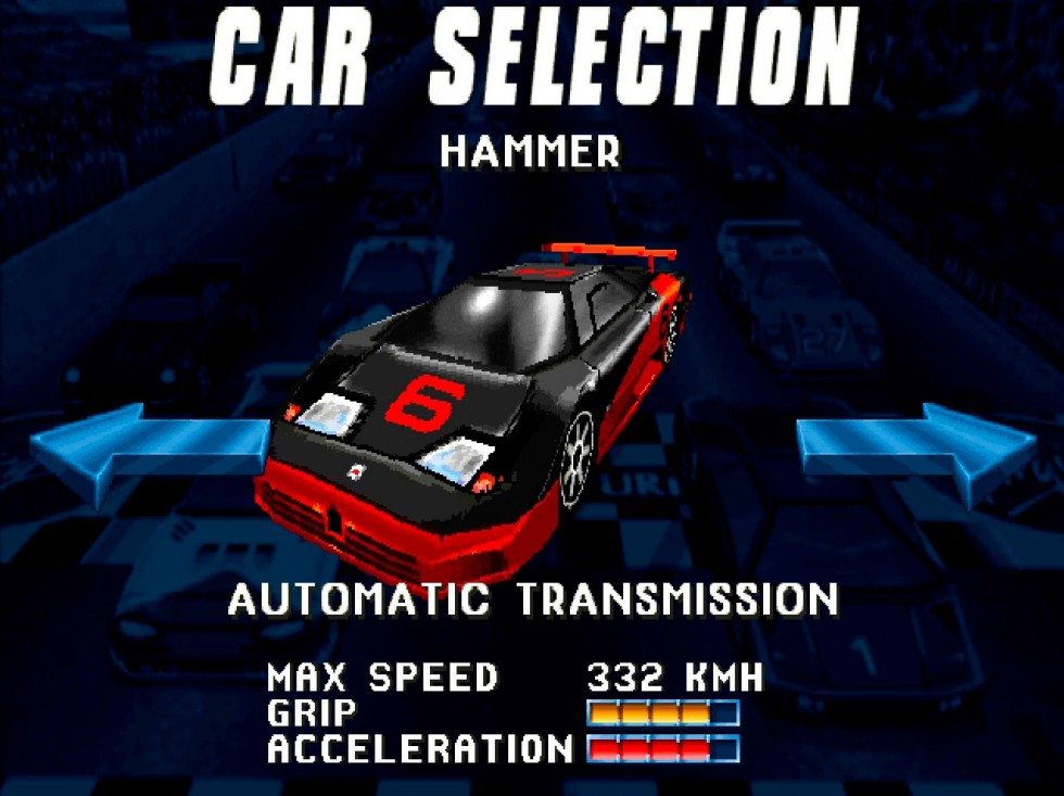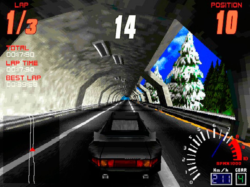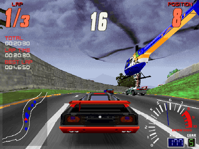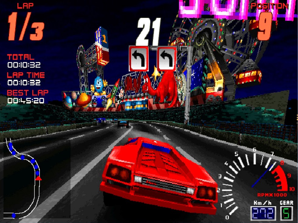 En éste no te dejan pasar en la última vuelta, igual fue coincidencia. Es todo un ir y venir (da igual la vuelta) entre la última posición (te pillan al mínimo descuido o sin él) y la primera (te esperan). De aquellas pocos equipos de desarrollo tenían más de 20 personas, así que estaban en la media. Sencillamente ofrecieron lo que se podía ofrecer de aquellas… que es más de lo que tenía Daytona USA y Speed Haste, también el 95.