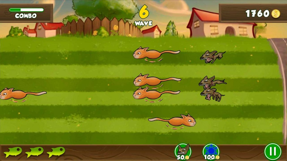 Los gatos serán cada vez más numerosos según vayan llegando las oleadas y además existen distintos tipos de gatos, más veloces o que requieren varias pulsaciones para darse por satisfechos y con un sonrisa desaparecer. Tras probarlo un rato me he destrozado la muñeca una vez transcurridas varias partidas. Para que la tarea sea más fácil, dispondremos de extras que podremos comprar con dinero que iremos acumulando según pasen las rondas. Estos extras son perros que podremos colocar a la derecha y que correrán detrás de los gatos en caso de que alguno se nos escape y un poder para detener el tiempo y poder limpiar la pantalla rápidamente.
